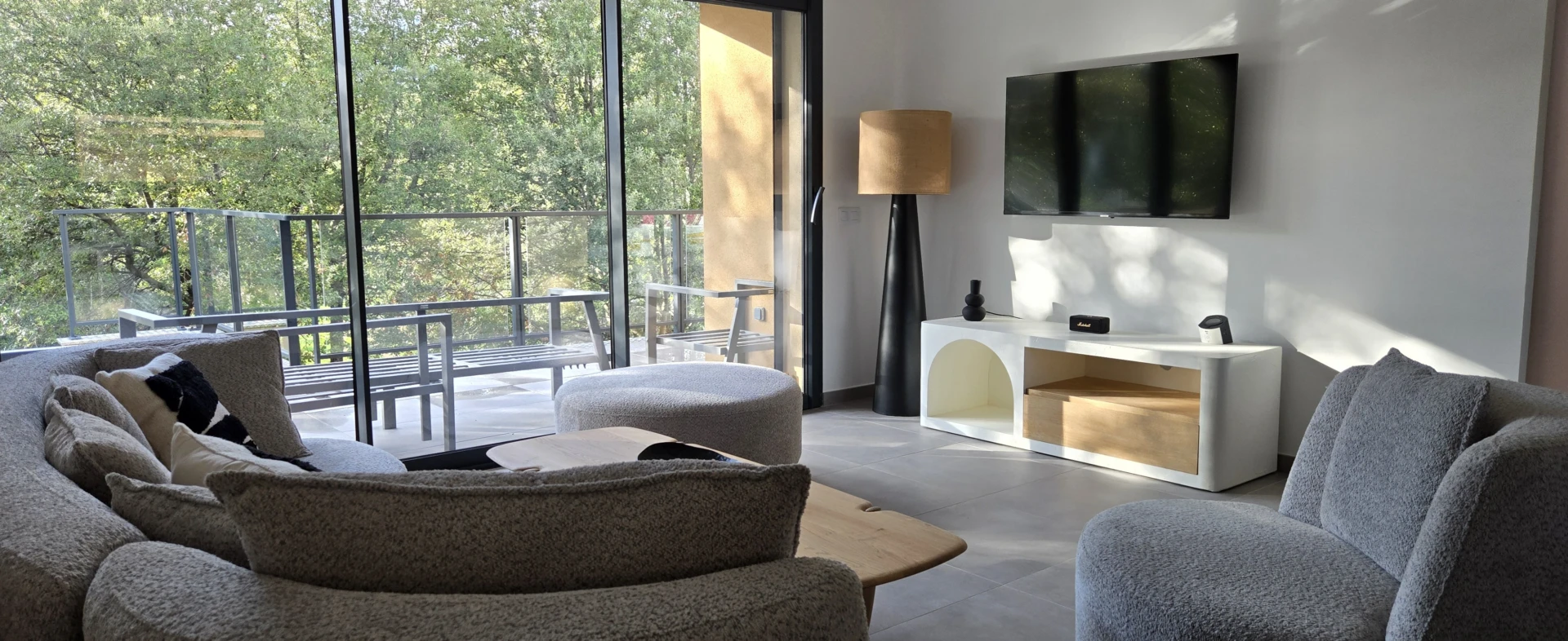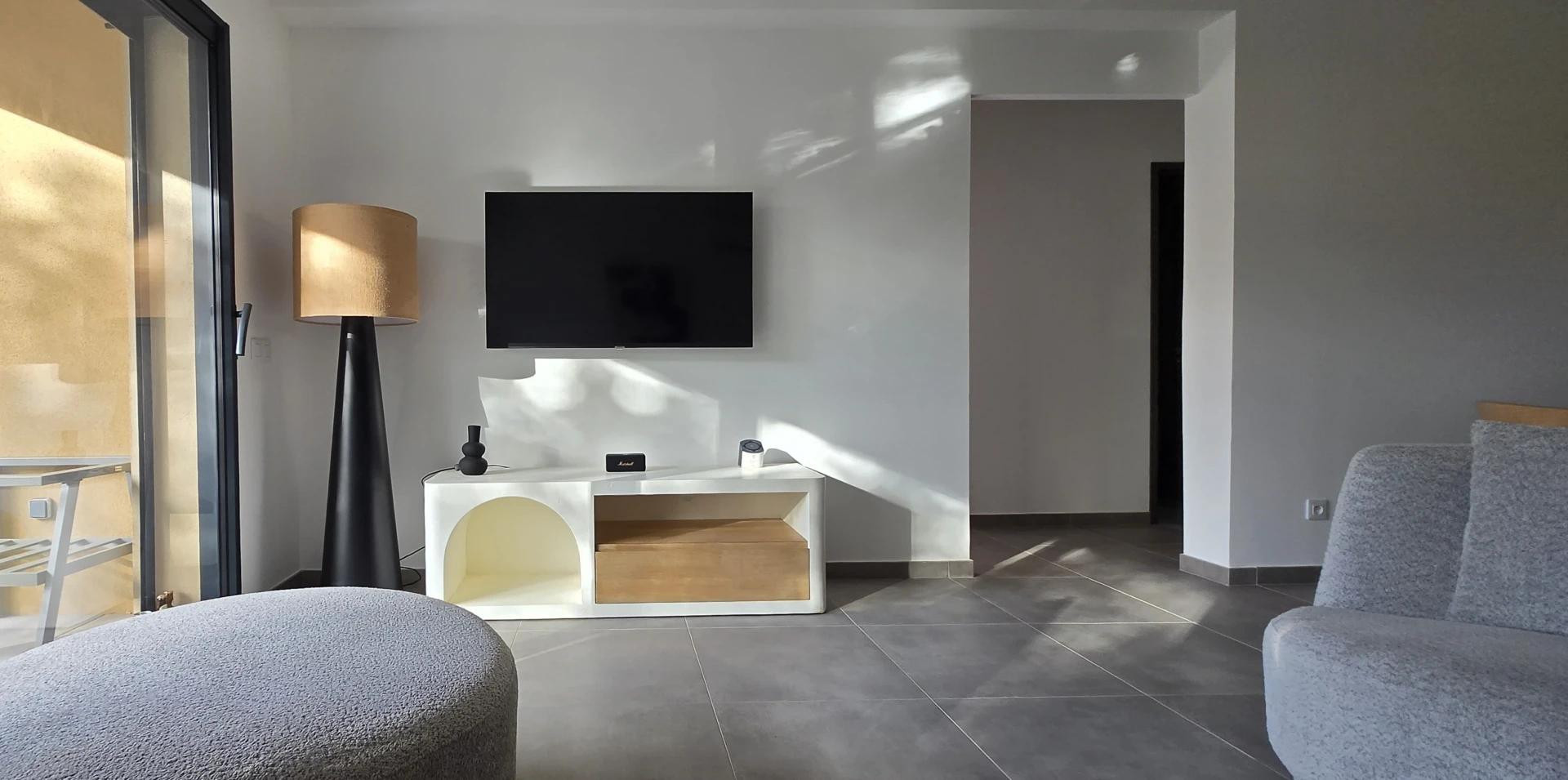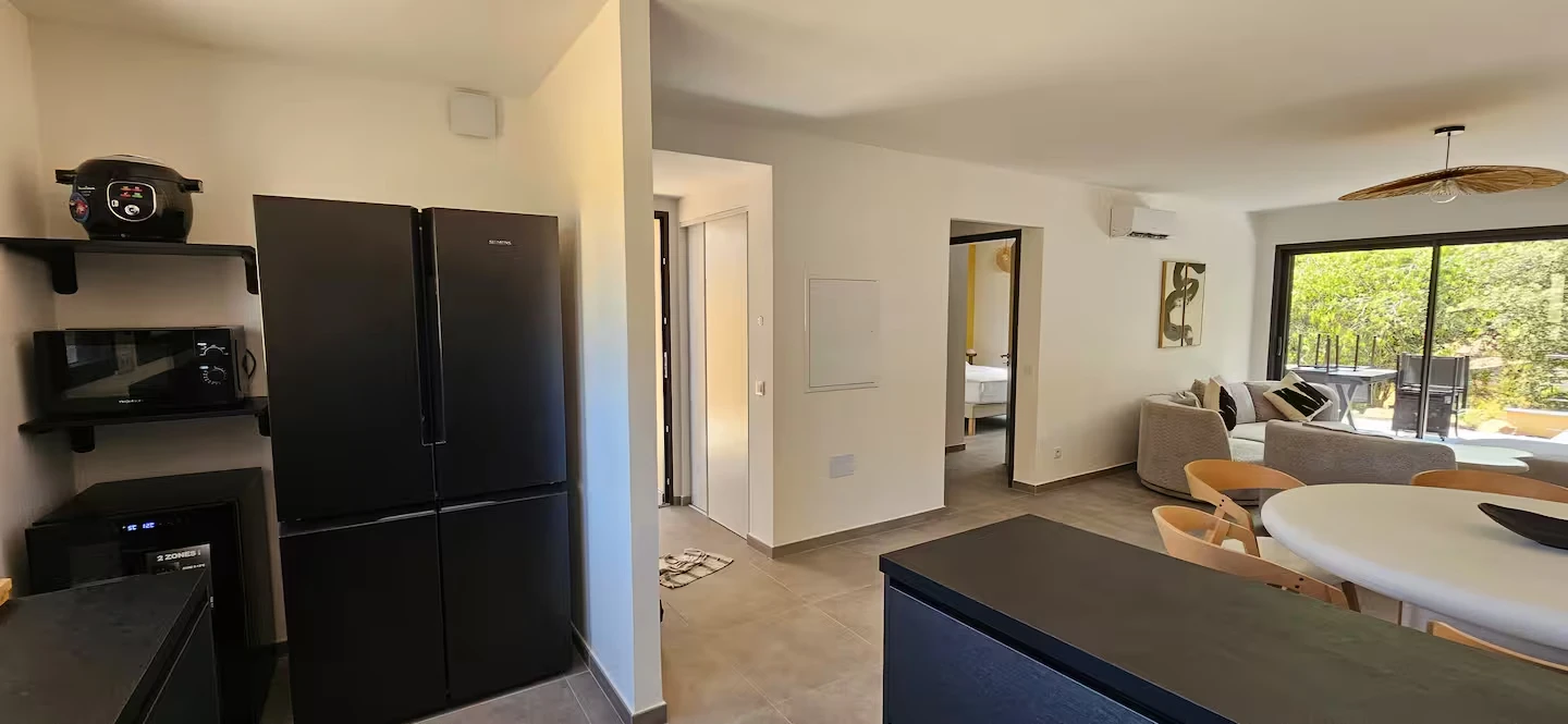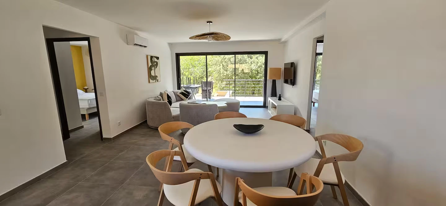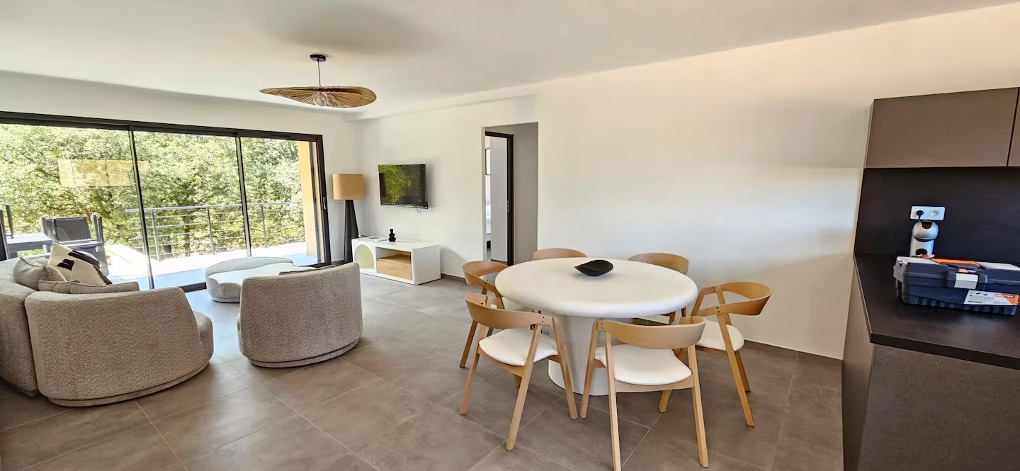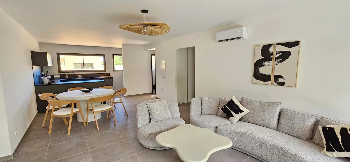 • Séjour / salon lumineux avec cuisine ouverte et grande baie vitrée donnant sur la terrasse couverte.