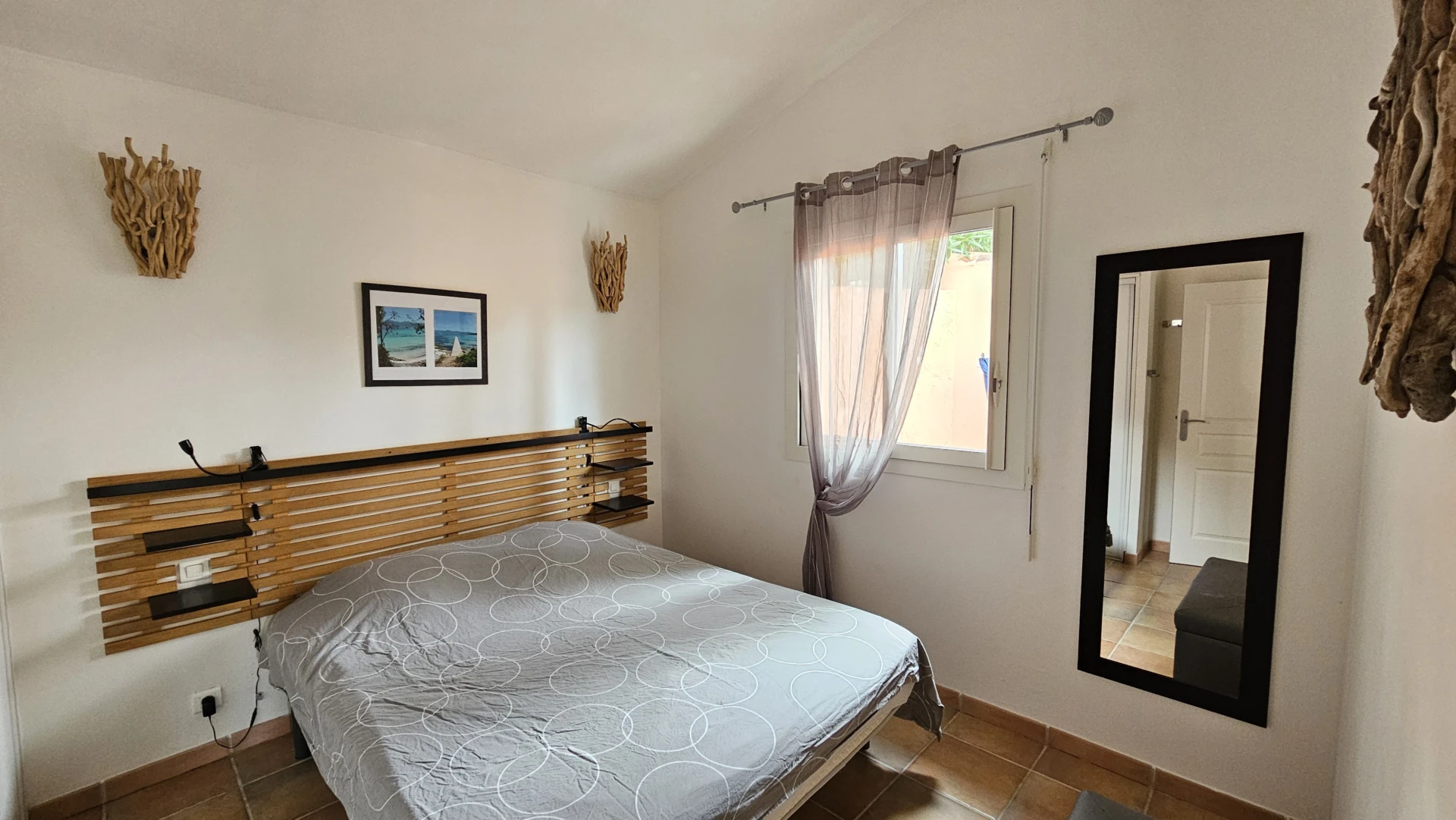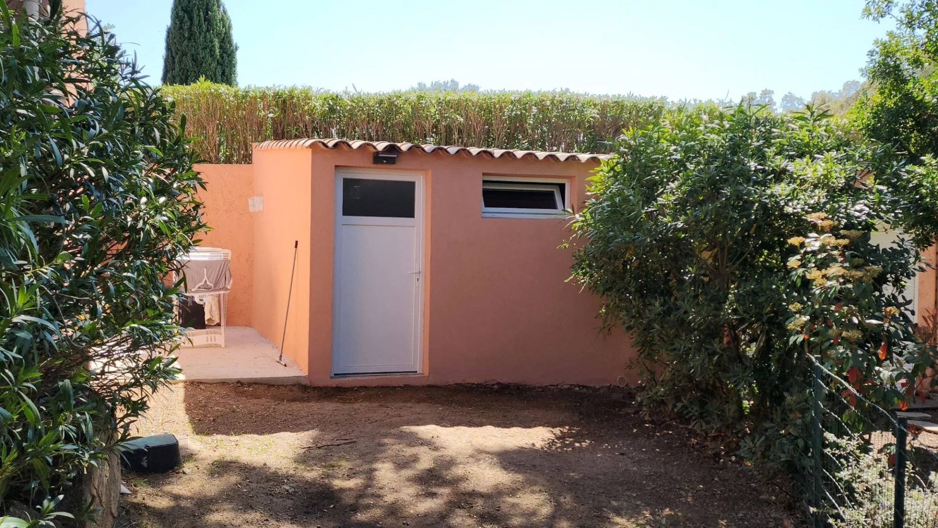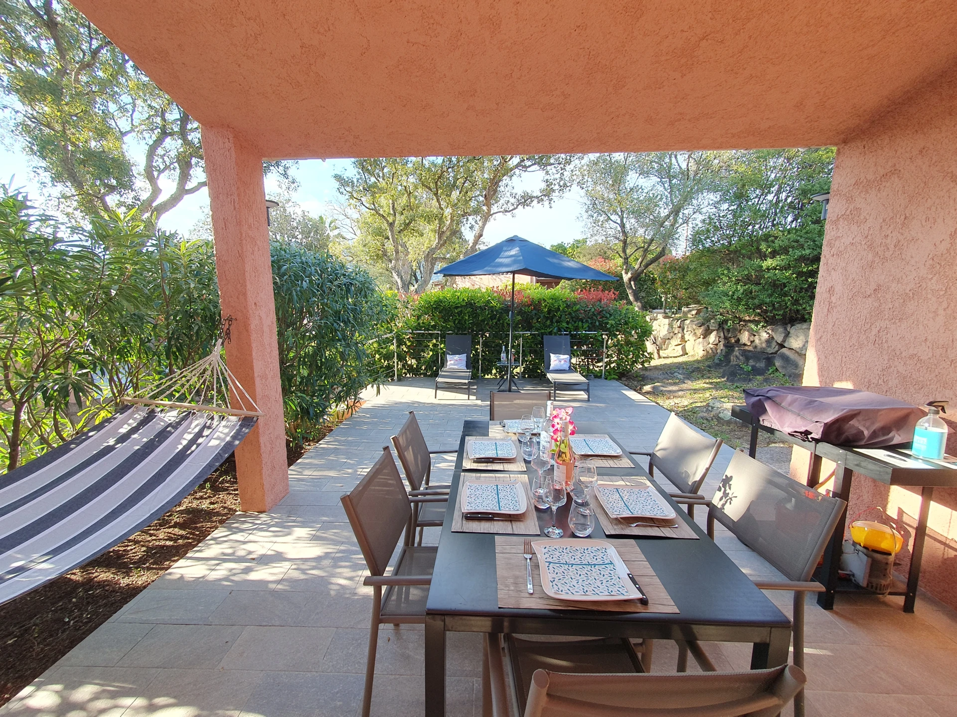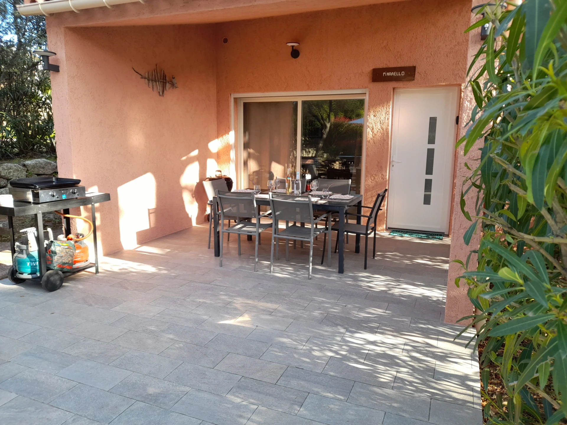 Villa climatisée 5 personnes non mitoyenne de plain pied, séjour donnant sur une terrasse couverte avec hamac, barbecue et plancha, et une terrasse de 20 m². Buanderie de 11 m² avec lave-linge, coffre avec jeux de plage.